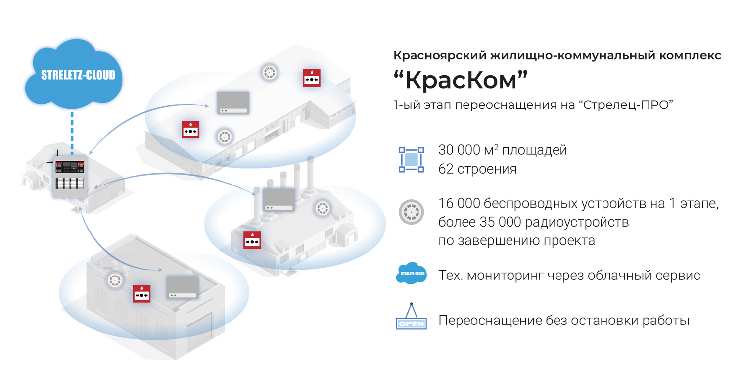 Для предприятия «КрасКом» обеспечение безопасности своих объектов всегда было приоритетной задачей. Прежняя отечественная проводная система пожарной сигнализации, основанная на базе старого американского протокола Ademco, требовала срочной модернизации согласно предписаниям надзорных органов. Так началась масштабная работа по переоснащению объектов «КрасКом» современной беспроводной системой безопасности «Стрелец-ПРО», выполненная компанией «Герц».