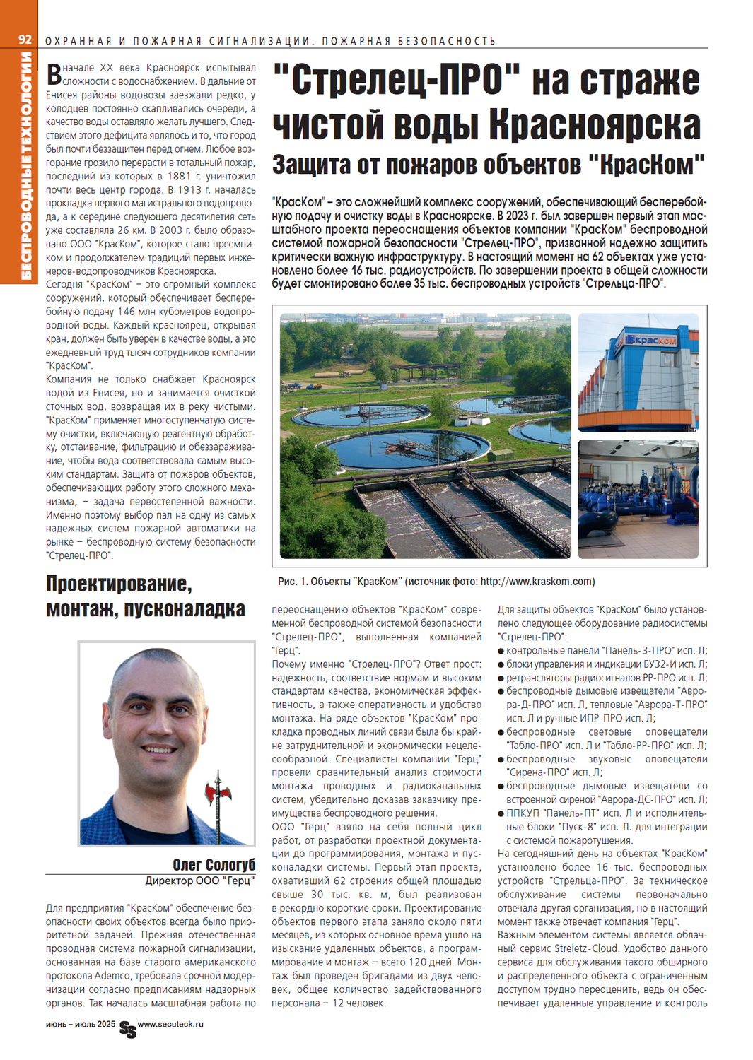 «КрасКом» – это сложнейший комплекс сооружений, обеспечивающий бесперебойную подачу и очистку воды в Красноярске. В 2023 году был завершен первый этап масштабного проекта по переоснащению объектов компании «КрасКом» беспроводной системой пожарной безопасности «Стрелец-ПРО», призванной надежно защитить критически важную инфраструктуру. В настоящий момент на 62 объектах уже установлено более 16 тыс. радиоустройств. По завершению проекта в общей сложности будет смонтировано более 35 тыс. беспроводных устройств «Стрельца-ПРО».