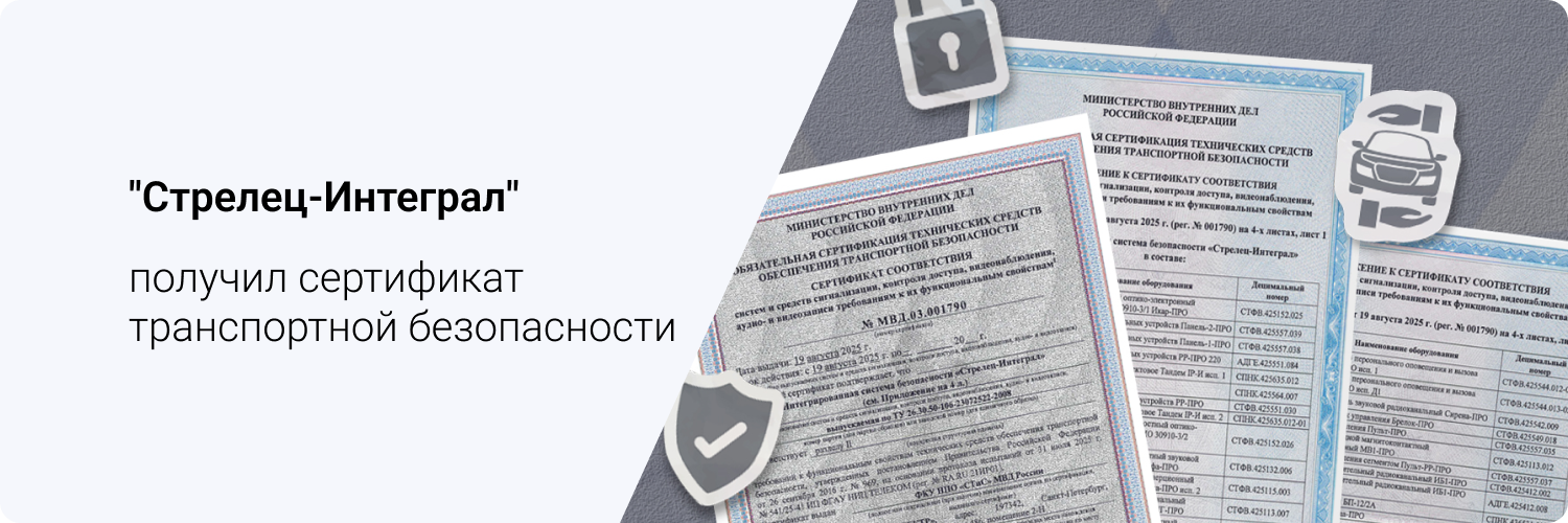 Устройства интегрированной системы безопасности (ИСБ) "Стрелец-Интеграл" успешно прошли все необходимые испытания и получили сертификат соответствия разделу II требований к функциональным свойствам технических средств обеспечения транспортной безопасности, установленных постановлением Правительства Российской Федерации от 26 сентября 2016 г. № 969.